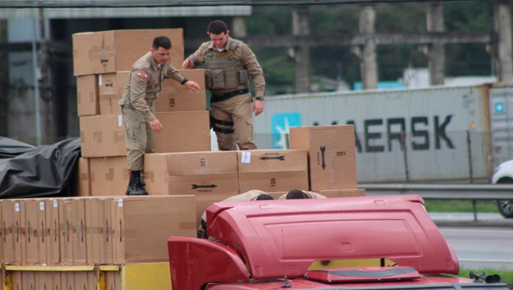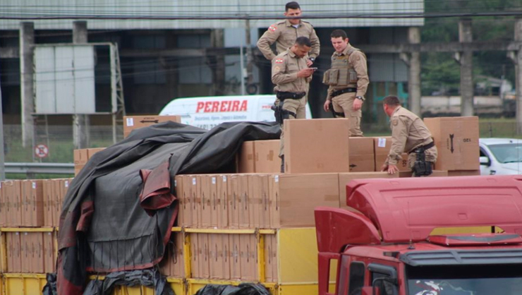 Após denúncias, o caminhão foi abordado para averiguação as margens da BR-101. Na abordagem o condutor, identificado pelas iniciais C.S.N., não soube descrever exatamente a carga transportada, informando se tratar de material para fraldas, porém após buscas a guarnição percebeu se tratar de refil para produção de cigarros. Duas notas fiscais descrevendo produtos distintos, com destino no estado do Rio Grande do Sul também foram encontradas.