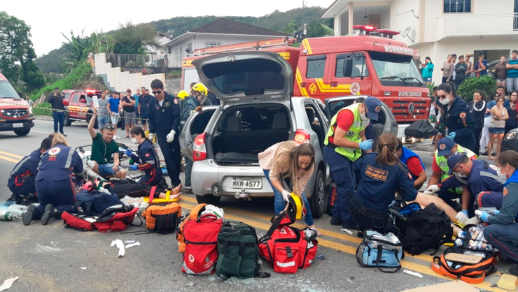 Um homem e três mulheres ficaram feridos em um grave acidente envolvendo dois veículos em Palhoça. A colisão frontal entre um Toyota Ethios e uma camionete Hilux foi registrada na tarde deste domingo (20), no bairro Alto Aririu, local conhecido como Morro do Gole.