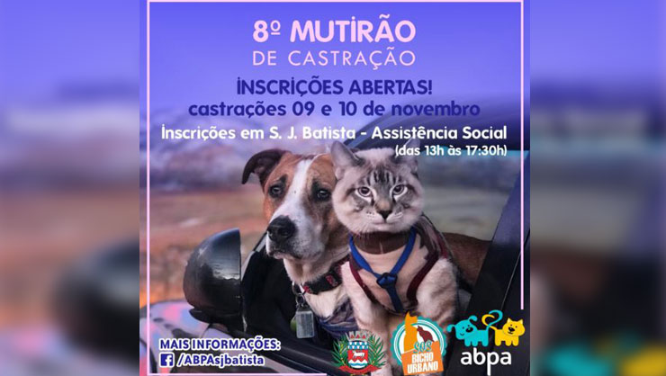 A administração municipal de São João Batista, em parceria com a Associação Batistense Protetora dos Animais (ABPA) e a SOS Bicho Urbano, promove o 8º Mutirão de Castração de Cães e Gatos nos dias 9 e 10 de novembro. As inscrições devem ser realizadas junto à secretaria de Assistência Social na rua Tibúrcio Taurino Bozzano, nº 210, das 13h30 às 17h30, enquanto houver disponibilidade.