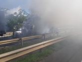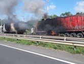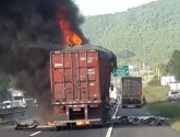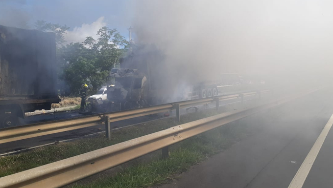 Com o impacto da batida um dos caminhões pegou fogo e o motorista não conseguiu sair a tempo do veículo. Os outros dois motoristas saíram ilesos.