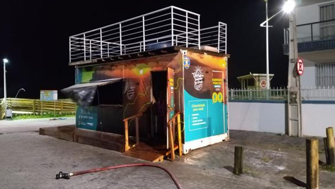 Um quiosque localizado na praia de Bombas em Bombinhas, ficou destruído após um incêndio na madrugada desta quarta-feira (25). O contêiner fica na orla da praia e apresentou risco para as residências próximas, devido as grandes proporções das chamas.