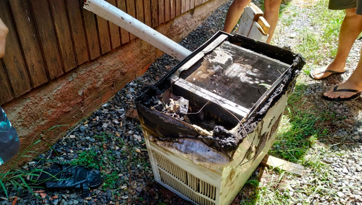 O combate ao fogo foi iniciado e controlado por vizinhos até a chegada dos socorristas. Bombeiros informaram que fogo iniciou no ar-condicionado.