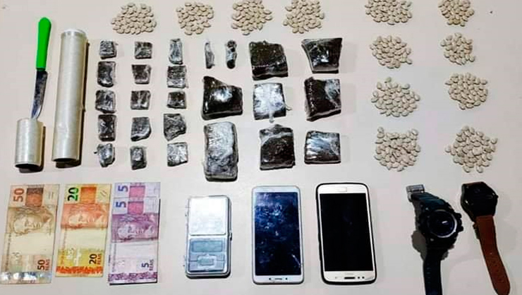 Diante dos fatos a polícia se deslocou até a residência da feminina onde após buscas 454 gramas de maconha, uma balança de precisão, 14 comprimidos de Ecstasy, uma faca utilizada para fracionar a droga, R$ 80 em espécie, dois relógios e dois celulares, foram localizados.