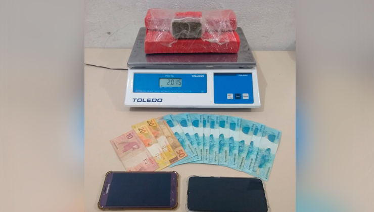Ao serem revistados, foram encontrados R$1,1 mil com o homem, além de um celular. Um outro aparelho também foi localizado com a mulher. No veículo, escondido no assoalho do carona, os policiais acharam dois quilos de maconha.