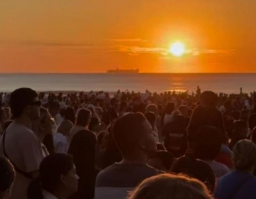 Multidão participa de evento religioso ao amanhecer na Praia de Balneário Camboriú